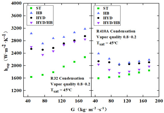 As can be seen in Figure 2, the condensation heat transfer coefficients of R410A and R32 in the smooth tube increase linearly with the mass flow rate; however, in the three enhanced tubes (HB, HYD, and HYD/HB) the HTC first decreases and then increases. This may be due to the fact that when compared to smooth tubes, enhanced heat transfer is produced in the three enhanced tubes as a result of turbulence and an increase in the heat transfer surface area. Compared to smooth tubes, herringbone tubes have some special protrusions on the inner wall. These structural protrusions disrupt the fluid boundary layer, enhancing fluid disturbance and mixing. Additionally, the extended surface area generated by these protrusions is beneficial for enhanced heat transfer. The enhanced tubes with hydrophobic surfaces create a thin liquid film on the wall, which has lower surface tension. Therefore, when condensing fluid flows through the tubes, the presence of the liquid film makes it easier for the fluid to transition into turbulent flow within the tube. Turbulent flow disrupts the boundary layer and removes the thicker thermal resistance layer, thereby increasing the heat transfer coefficient. At low mass flow rates (below 60 kg·m−2s−1), the refrigerant flow velocity is low, and the condensation process inside the tube is mainly the result of surface heat transfer. Turbulent heat transfer may only have a small contribution to the overall heat transfer process, so the heat transfer coefficient is high. As the mass flow rate increases, the refrigerant flow velocity increases; the heat transfer process gradually transitions from surface heat transfer to turbulent heat transfer. Turbulence suppresses the heat transfer process, resulting in a decrease in the heat transfer coefficient. As the flow rate continues to increase, the turbulence intensity reaches its peak and then gradually decreases. The degree of mixing between the refrigerant and the heat transfer surface gradually increases and, therefore, the heat transfer coefficient also gradually increases. This indicates that the three enhanced tubes are more suitable for condensation heat transfer under low mass flow rate (below 60 kg·m−2s−1) and high mass flow rate conditions (above 120 kg·m−2s−1). Additionally, the heat transfer coefficient is slightly lower for medium mass flow rates (60~120 kg·m−2s−1) and condensation heat transfer designs in this range should be avoided.
