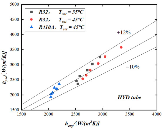 Conditions (refrigerants used (R410A and R32), saturated temperatures, vapor qualities, and tube diameters) considered in the current experiment were within the range of the Cavallini et al. model. These facts made the model developed by [13] the correlation that could be modified for use with the enhanced tubes from this study (HYD, HB, and HYD/HB tubes).