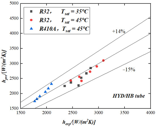Comparison of differences between predicted (using the modified Cavallini et al. [13] formula) and experimental values when using the HYD/HB enhanced tube, using R32 and R410A, with saturation temperatures of 35 °C and 45 °C tubes.