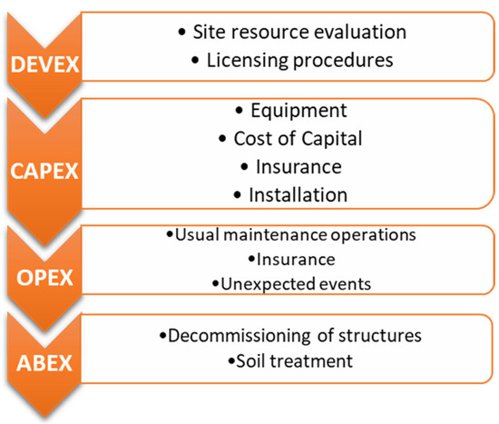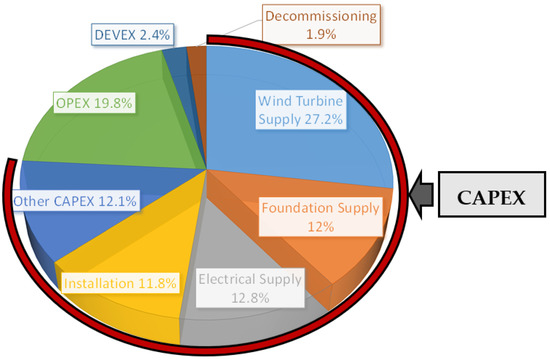Development expenditures (DEVEX) are related to the processes produced prior to the installation of the farm. They represent, typically, a small slice of the farm overall costs—Figure 1. CAPEX are the costs associated with the materials required for the construction and operation of the OSWF. They include the costs of equipment, such as electric cable connections, turbines, and foundations, but also the cost of installation, the cost of capital, and the cost of insurance. According to the sources used on Figure 2, CAPEX is responsible for approximately three quarters of the levelized cost of energy (LCoE) of an OSWF.