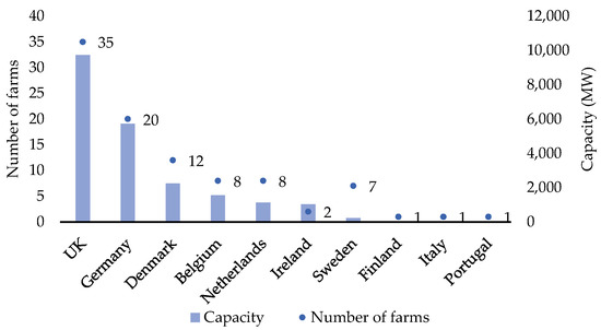 Capital expenditures for OSW are currently declining, but this was not always the case in the past, where OSW CAPEX rose unexpectedly up to values higher than EUR 4 million per MW of new capacity back in 2016 [15]. Furthermore, impacts of the pandemic and the Ukrainian war still need to be considered in future models. In this research, the OSWF database [15] and an estimation model for future OSW CAPEX [41] are used. The number of farms and installed capacity per country considered on the said database is presented in Figure 3.