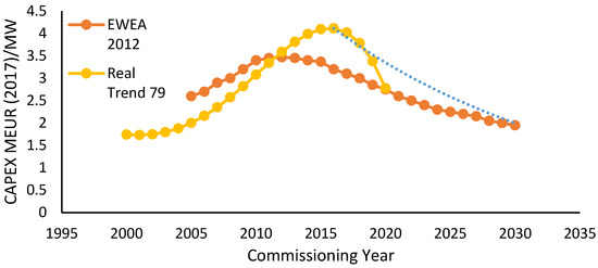 Then, the non-technical influences affecting the CAPEX per MW of OSW, which can be caused by demand peaks, variations on price indexes, and changes within policy schemes, amongst other socioeconomic factors, are considered using an exponential trendline that connects the CAPEX/MW peak of OSW in 2016 (at 4.23 million EUR/MW) [15] to the value expected for OSW by WindEurope by 2030, at 2 million EUR/MW [42]—as shown in Figure 4. It is important to highlight that these three trends shown in Figure 4 reflect non-technical influences on CAPEX. Real Trend 79 was built by averaging the CAPEX of each farm for each commissioning year.