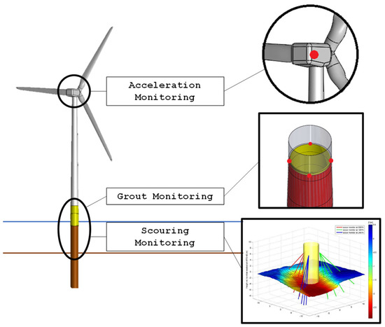 Scheme of the generic locations of monitoring system implementation for grout, scouring, and tower dynamics.