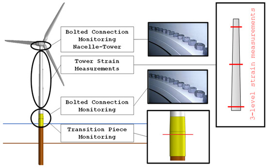 Figure 7 presents the generic locations for the installation of the sensors dedicated to monitor the bolted connections, the tower stress measurements, and the transition piece.