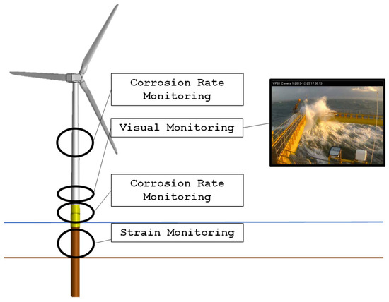Figure 8 presents the generic locations for the installation of the sensors dedicated to monitoring corrosion rates on the turbine tower and transition piece. This can be measured using corrosion rate data loggers, using electrical resistance sensors to evaluate the corrosion speeds registered between two different points of the structure. These corrosion rate measurers are commercially available from some suppliers with offshore expertise, such as Zensor and Cosasco. For the suggested setup, two of these systems are installed, one for each support structure (transition piece and tower). Then, visual monitoring is suggested based on CCTV recording from three different cameras, to cover for the 360 degrees around the monopile. Finally, strain measurements on the monopile itself are also recommended to eventually detect signs of structural buckling.