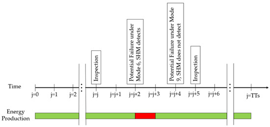 In contrast, Figure 10 depicts the sequence of events for a turbine equipped with Structural Health Monitoring (SHMs). While in operation, a potentially critical failure arises under Mode 6, which is promptly detected by the SHMs. Consequently, the turbine is promptly shut down, and maintenance operations are conducted to address the situation. Subsequently, another potentially critical failure emerges under Mode 9, which goes undetected by the SHMs. Nonetheless, the issue is successfully resolved during the subsequent inspection, ensuring the turbine returns to a fully operational state.
