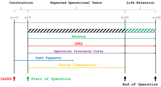 Framework of the cash-flow model developed, which considers three main life-cycle stages: construction, operation, and life extension.