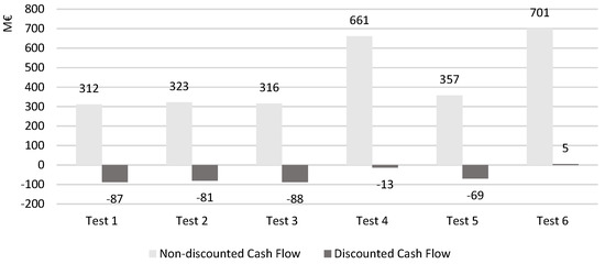Figure 14 compares the non-discounted and discounted cash flows of the six tested scenarios.
