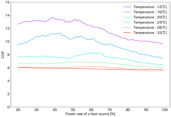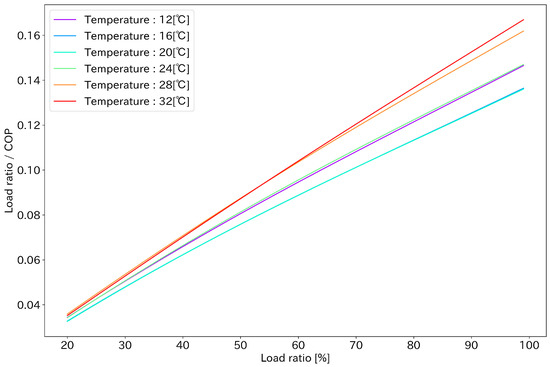 Assuming that increasing the output ratio increases the energy consumption, we mentioned that in the objective function is a monotonically increasing function with respect to , but in reality, based on the estimated COP, when was plotted, a monotonically increasing line was obtained as shown in Figure 6. Optimization can be performed for this COP function using a gradient-based optimization method.