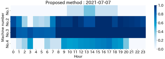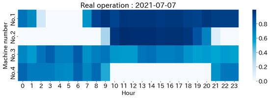 The specific operational schedules generated are examined here. Figure 7 presents the operational schedule for a given day while Figure 8 and Figure 9 depict the schedules proposed by our methodology with the SVR and KNN COP models, respectively, for the same day. The color scheme in these figures indicates the ratio of operation intensity to maximum output. Figure 10 and Figure 11 show the heat demand and temperature variations, respectively, for the same day. As can be inferred from Figure 7, the actual operation bases itself on chiller No.3, adjusting the operation of other chillers in line with the heat demand changes. However, the proposed operation schedule based on the SVR COP model, as shown in Figure 8, operates primarily on chillers No.2 and No.3. The main difference appears in the comparatively smaller demand period of late night to early morning. While the actual operations mainly involve chillers No.3 and No.4, with chiller No.1 serving as a supplement, the proposed methodology instead primarily operates chillers No.2 and No.3, with No.4 serving in a supplementary capacity. Figure 12 presents the COP curves of each chiller at a temperature of 26 degrees. Here, chiller No.3 consistently exhibits the highest COP, followed closely by No.2. Hence, based on the COP estimated from the data, it is rational under these weather conditions to prioritize chiller No.2 over No.4. This reasoning is reflected in the schedule generated by our proposed methodology. Moreover, chiller No.4 is more efficient than No.1 when the output ratio is small, but this is reversed around a 75% output ratio. Thus, under these weather conditions, there is a need to switch between chillers No.1 and No.4 according to the heat demand size. Our proposed method prioritizes chiller No.1 when the daytime heat demand is high and then switches to chiller No.4 in the evening when the heat demand decreases, demonstrating rational decision-making. It is difficult to consider both weather conditions and output ratio simultaneously in operations based on intuition and experience. Therefore, a scheduling methodology, such as our proposed one, which is based on an equipment efficiency model derived from actual data, is effective.