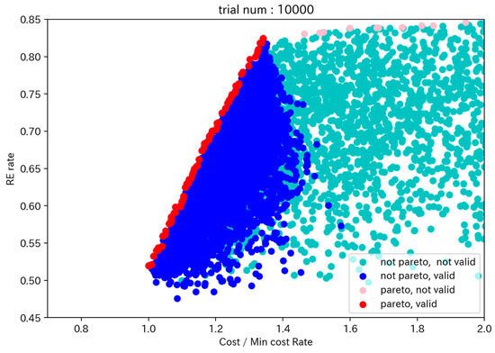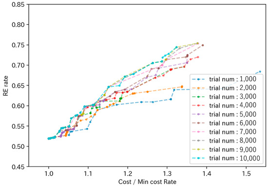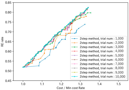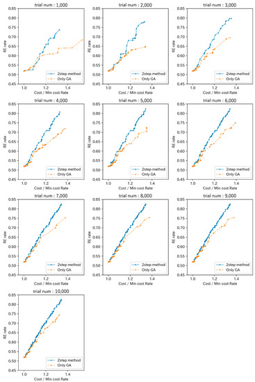 To compare and evaluate the differences between the Pareto solutions calculated by the two methods at the same search count, Figure 15 illustrates the Pareto solutions for both methods for search counts ranging from 1000 to 10,000. As depicted in the figure, the two-stage optimization method (labeled “2 step method” in the figure) generally positions the Pareto curve to the upper left more so than the method using only the GA (labeled “Only GA” in the figure). This demonstrates that the two-stage optimization method can achieve a higher RE ratio at a lower cost.
