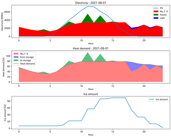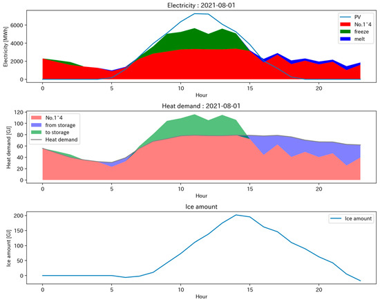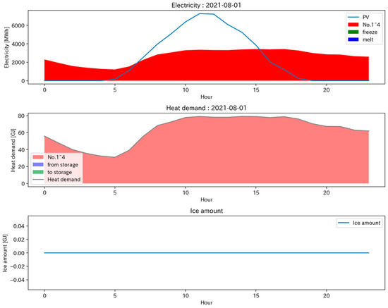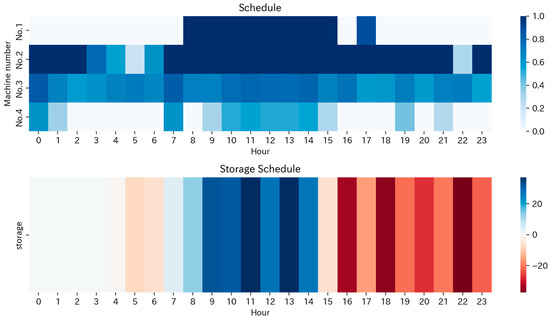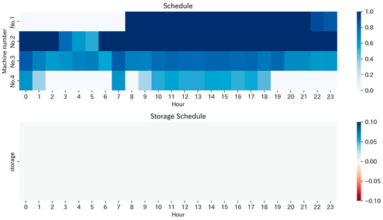 Figure 20 shows the power consumption, heat supply, and heat storage in the operation plan for the renewable-energy oriented point (cost ratio, RE rate) = (1.34, 0.82). It can be seen that surplus PV during the day is stored up to the maximum amount of ice that can be stored, and heat dissipation begins from the evening when the surplus power generation ceases. Although a slight amount of heat storage can be observed around 1–2 am, it does not contribute to improving the renewable energy ratio, nor does it contribute to cost reduction. Therefore, this is not an optimal strategy and suggests that there is room for further exploration of solutions. Figure 21 shows the operating schedule of the heat source equipment No.1 to 4 and the heat storage device for the same Pareto point. Considering the amount of heat supplied by heat dissipation from evening to night, the operating level of the heat source equipment is confirmed to be lower than that in Figure 19. Moreover, Figure 22 presents the power consumption, heat supply, and heat storage in the operation plan for a point with a balance between the cost and renewable energy orientation (cost ratio, RE rate) = (1.15, 0.65). While it absorbs surplus renewable energy during the day, it does not store as much as the renewable-energy oriented plan. Figure 23 shows the operating schedule of the heat source equipment No.1 to 4 and the heat storage device for the same cost-renewable energy balance oriented plan. The amount of heat dissipation at night is not as significant as in the renewable-energy oriented plan.