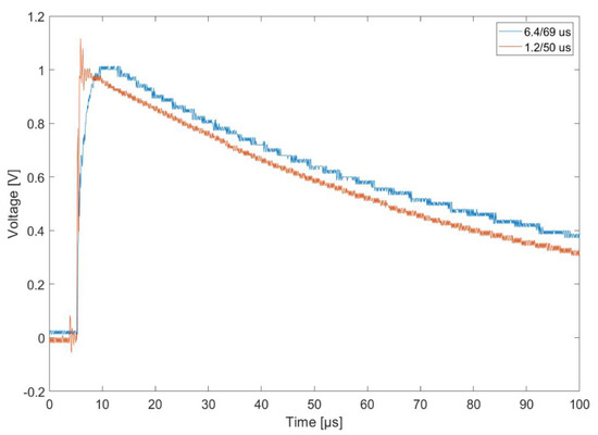 The 1.2/50 μs waveform (Figure 4) is described in the PN–EN 61000-4-5 standard and was used in open-circuit (or high impedance) tests. This voltage waveform (VW) characterizes the overvoltage created by lightning. This type of VW is used to verify that equipment withstands overvoltages of atmospheric origin [9,30,31].