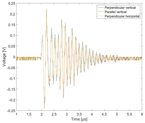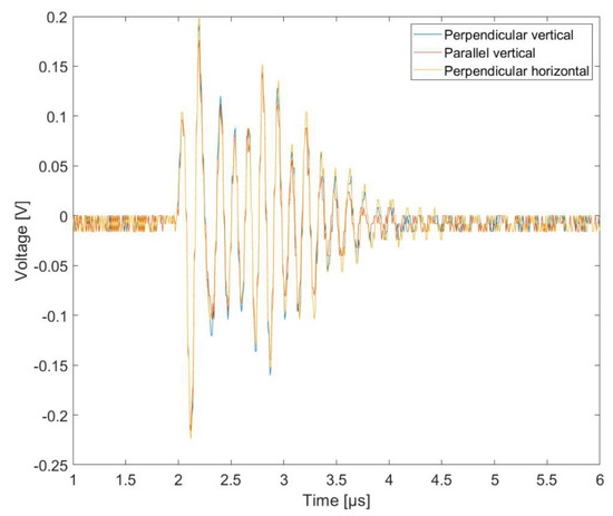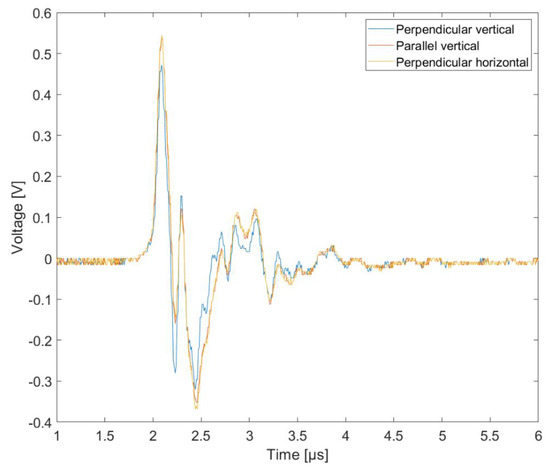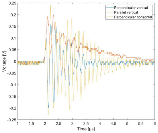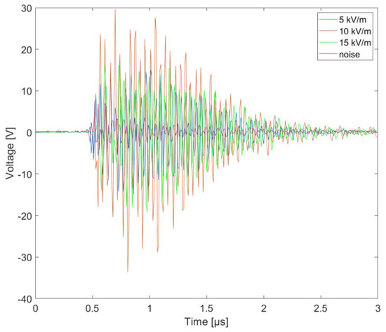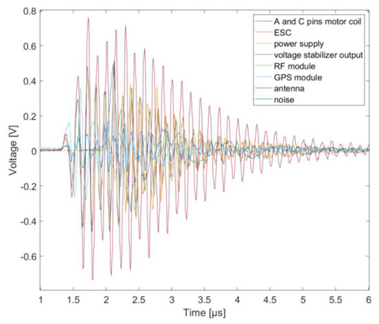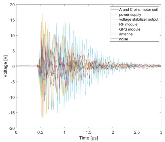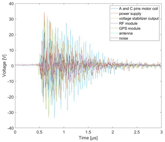 The choice of the voltage waveform parameters, both in terms of amplitude and characteristic times, was not accidental. Their parameters corresponded to the distance of the drone from the lightning discharge channel, as evidenced by numerous measurements and simulations of the developed mathematical models [34,35]. Measured signals form generators was shown in Figure 6.