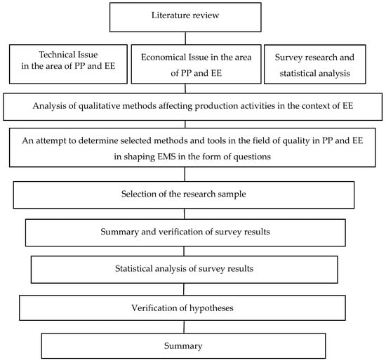 The presented research is the result of analysis of the scientific literature and identification of the cognitive gap in the area in question. This gap results from the approach taken by researchers of this issue that is slightly different to that presented in this study. Available publications contain the characteristics of barriers, indicators, and methods used as EMSs, but they do not examine the impact of their broad use in enterprises, the improvement methods in the field of quality management on EE, or the EMSs, if defined. Figure 1 presents the procedure used in this research.