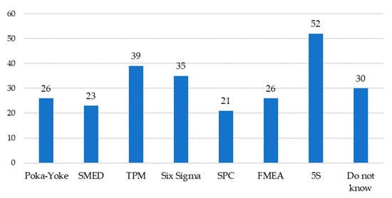 Question 1. What are the methods and quality tools most commonly used in enterprises in the field of PP management? This question is related to the specific objectives O1, O2, and O3. In order to answer the above question, basic tools and quality methods, i.e., Poka-Yoke, SMED, TPM, Six Sigma, SPC, FMEA, and 5S, were distinguished in Question 11 of the survey as well as accommodating the possibility of respondents adding their own answers. The concepts listed in the survey’s question were briefly described to minimize the risk of rejecting a given answer due to the lack of knowledge of the nomenclature. Of course, respondents in this case had the ability to mark more than 1 answer.