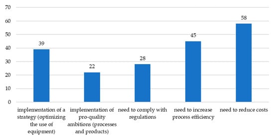Question 2. What are the reasons for implementing EE? This is related to the specific objective O1. On the basis of a literature review, several groups were distinguished here: the implementation of a strategy focused on optimizing the use of machines and equipment, the implementation of the pro-quality ambitions of the company in the field of processes and products, the need to adapt to the regulations, the need to increase process efficiency, and the need to reduce costs. In the survey structure, it was Question 7 in which more than 1 answer could be marked.