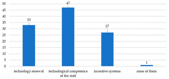 Question 3. What are the areas of implementing EEs in the studied enterprises? This is related to the specific objective O2, and the following areas were distinguished here (Question 8): technology renewal, raising the technological competence of the staff, creating incentive systems that encourage creative problem solving, and implementation of improvement ideas. Here, also, a place was provided for respondents to enter an additional answer. Only 1 of the respondents used the last option but did not identify the area, adding only “in none of the above areas”. For this question, respondents could also mark more than 1 answer.