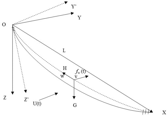 The initial configuration of the conductor adopts a parabolic formula. The initial horizontal tension of the conductor is H0, and the static horizontal stress of the conductor after icing is H1. Under the impact of wind load fw (t), the dynamic horizontal stress of the iced conductor is H (t), and the displacement of the iced conductor unit along the wind direction (y-axis) is v (x, t), and the vertical (z-axis) displacement is w (x, t). Ignoring the resonance component of the dynamic tension response of the conductor [14], the motion equation system of the iced conductor under the combined action of wind, ice, and the self-weight is [15]: