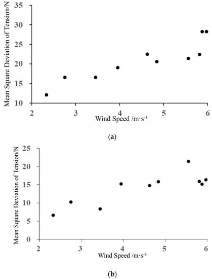 The scatter points of the axial tension increment at the end of the experimental iced wire and the corresponding instantaneous wind speed at the corresponding time are shown in Figure 4. To more intuitively explore the influence of wind speed on the axial tension at the end of the iced wire, the dynamic statistical values of tension were ana-lyzed, and the scatter points corresponding to the mean square deviation of the tension at the end of the experimental iced wire and the mean wind speed within 5 min were obtained, as shown in Figure 5. As the instantaneous wind speed increases, the increment of tension at the end of the iced conductor increases, the mean square deviation of axial tension at the end of the test steel strand and single conductor increases, and the dispersion increases.