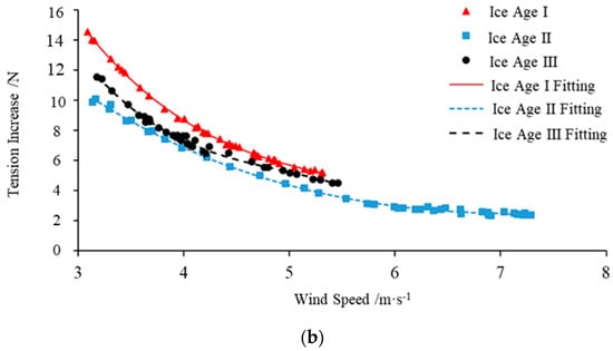 The tensional force data from a single conductor, which is captured during the same ice season but at different stages within a 5-min window, is plotted against the wind speed in a scatter diagram (Figure 6) to analyze the relationship between the dynamic tensional force increment of the tested conductor and the instantaneous wind speed. As the ice thickness increases, the axial tensional force increment rate at the terminal of the conductor decreases. Assuming the ice shape and the cross-wind length remain constant under the same instantaneous wind speed, when the ice thickness increases, it is found that the tension increment reduces.