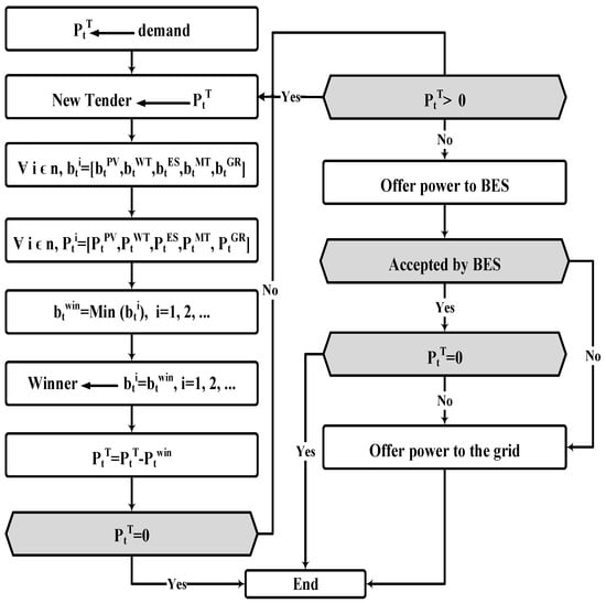 After choosing the winner agent using the tenderer, its provided power is subtracted from the requested power. The tenderer checks the supply–demand balance in the microgrid based on Equation (24). If there is still demand, another tender will be held. If there is extra power in the system, it can be injected into the ES or grid.