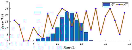 This section evaluates the effectiveness of the proposed algorithm, which was tested on a DC microgrid composed of WT, PV, MT, and ES. These resources are connected to the load through their converters to satisfy demand and transfer power between themselves. In addition, a 30-kW inverter is connected between the microgrid and the utility grid, which supports the balance between supply and demand. Figure 5 represents the selling price of electricity to the grid and the time of electricity consumption. Profiles of the power generated by PV and WT as well as the power demanded are shown in Figure 6 and Figure 7, respectively. Additional required data, i.e., about limitations of generators and bid parameters, are presented in Table 1, Table 2 and Table 3.