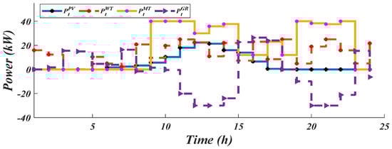 Figure 8 illustrates the operation results of PV, WT, and MT. It can be recognized that PV and WT agents inject the generated power into the microgrid over 24 h. This is expected in reality because they have the cheapest energy compared to others, but the MT agent behaves smarter than PV and WT. During off-peak, the MT agent does not have any desire to participate in the tender. However, during peak times, as shown, MT is more interested in cooperating in sharing power. During these times, it prefers to produce the highest power to sell to the grid. Through this performance, MT gains more profit at on-peak times rather than off-peak times. For this reason, during peak times, the maximum power is generated and, for the rest of the time, it is in off mode or provides the requested power. From 1400 h to 1900 h, due to the selling price of electricity to the grid being close to its offer price, the strategy of the MT agent is to provide minimum power and stay in reserve. Because of the starting time, the MT agent prefers to be in on mode during these times and have a quick reaction to sudden changes.