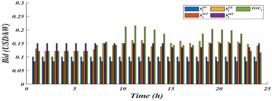 Figure 12 shows the offer price of agents during 24 one-hour periods. The ES agent does not participate in the tender during the charge period, and when its SOC is minimum (for example at 0700, 1000, 1400, 1600, and 1800 h). In the beginning, the SOC of ES is 70% and its offer price is 0.13 $/kW. It is charged by WT and its offer price decreases based on Equation (33). When holding the tender, the ES agent tries to compete with the MT and grid agents, for instance at 0200 hrs, ES reduces 5% of its offer price to win the tender (Equation (30)). The ES agent, over 24 h, tries to reduce its offer price to sell power and gain more profit. The MT agent also offers discounts when it is in the reserve state (here between 1500 and 1900 h). During this period, it needs to produce its minimum instantaneous power to be on standby.