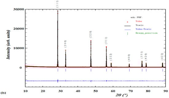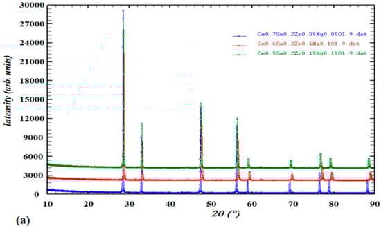 The collected data of XRD spectra for the 3 synthesized series of Mgx doped Ce 0.8−2x Sm0.2 Zrx O2−d, x = 0.05, 0.1 & 0.15} were analyzed by Rietveld analysis at RT after the final sintering temperature of 1400 °C appears in Figure 2 with peak indexing showing the single-phase purity. The Rietveld analyses of the XRD patterns of all materials confirm a stable single-phase cubic structure in the F m-3m space group, a fluorite type with JCPDS number 35-0816 with nearly similar cell parameter a = 5.4 for all compounds.