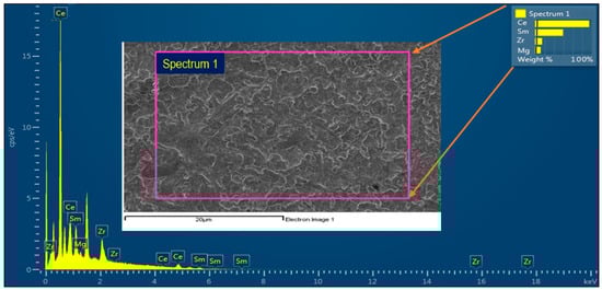 But the grain growth occurred on 5% doping of Mg during the densification [49] compared to other percentages. It was observed that 1 μm average grain size for the pellet sintered at 1200 °C, whereas for 1300 1.6 to 2.3 μm and at the final temperature of 1400 °C, the grain size ranged from 2.5 to 3.7 μm; from Figure 3, Figure 4 and Figure 5 of the compound Ce0.7Sm0.2Zr0.05Mg0.05O1.9. Showing some inhomogeneity in grain sizes due to higher sintering temperatures, but the most interesting is getting well compact and dense electrolyte materials compared to the other 2 compounds. Some pores started to occur, with higher Mg doping, abnormal grain growth resulted in some pores being trapped inside the microstructure even with higher sintering temperatures it is difficult to erase [50,51,52]. The EDX elemental analysis of CSZM was investigated, as shown in Figure 6 and Table 2 showing CSZM with the selected spectrum with the existence of all chemicals Ce, Sm, Zr, and Mg with a total percentage of 100% without any other impurities and proof of a full and complete solid-state reaction occurred for all compounds showing a pure fluorite type phase. What was interesting was the homogeneity of the surface. There is no existence of any impurities or agglomerations [52] and it is clearly observed in the selected spectrum, considering this case for all synthesized compounds with the different doping percentages of Mg i.e., 5%, 10%, and 15%.