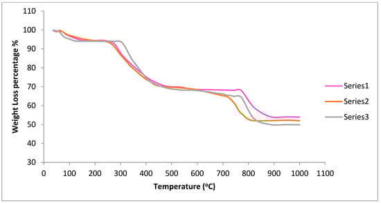 Thermogravimetric data was collected on uncalcined samples of Ce0.7Sm0.2Zr0.05Mg0.05O1.9 (5%Mg), Ce0.6Sm0.2Zr0.1Mg0.1O1.9 (10% Mg) and Ce0.5Sm0.2Zr0.15Mg0.15O1.9 (15% Mg) to know the sintering behavior of the samples. The weight loss started around 60 °C, and lost about 6% until 275 °C due to the evaporation of the absorbed water molecules. From 275 °C to 730 °C, another big loss (about 30%) was observed due to the decomposition of some oxides and organic fuel into different gases, such as nitrogen, carbon dioxide, and water vapors [53]. The final weight loss was observed until 900 °C, about 15%. Figure 7 illustrates the TGA profile of all 3 samples. There are small differences between the samples which can be neglected. The high-temperature loss is normally related to the chemical reaction [54,55], oxygen vacancy formation, and valence change of the constituting cations. This change confirms the full crystallization and phase formation above 900 °C. All gaseous products generated by volatilization and chemical reaction are transferred from the furnace chamber with the help of N2 gas, which guarantees no interference with the sample during thermal treatment. TGA data were taken on uncalcined samples, and the 50% weight loss is normal. The samples were heated under a nitrogen atmosphere to avoid the presence of H2 or O2. The high-temperature region of TGA in the nitrogen atmosphere indicates the oxygen loss from the crystalline. All XRD patterns were taken after TGA and the final sintering for CSZM was collected for the structure analysis as referred to that in Section 3.1 showing a pure structural cubic phase which was also confirmed using SEM and EDX analysis.