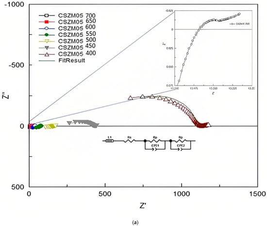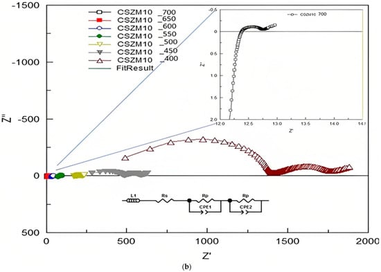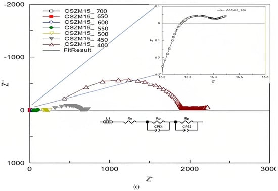 The EIS measurements were used to find out the electrical properties of CSZM compounds. The related electrical properties of the synthesized electrolyte material in a symmetrical supported cell testing based on anode-supported materials as can be observed from Table 3, and the resultant ionic conductivity was calculated accordingly. Through Nyquist plots and with the relevant fitting results, it was easy to identify the needed information about the separate contribution of grain resistance, grain boundary resistance, and electrode process. The EIS measurements were achieved using a Solartron 1255 (Schlumberger) frequency response analyzer (0.01 Hz~1 MHz). Results from Nyquist patterns were analysed using Z-plot software followed the included circuit range of 400 °C to, 700 °C with a step of 50 °C in wet 5% H2/Ar. Figure 8a–c show the fitted impedance plots obtained for CSZM oxides within the range of 400 °C to 700 °C. Resulted plots were evaluated by comparing with equivalent circuits by the start of inductance L1 and followed by semicircles of two regions indicating the polarization resistance Rp from the electrode as grain boundaries [56] along the whole tested ranges.