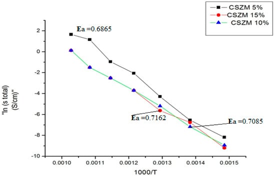It was clear from the given results that the compounds of CSZM electrolyte materials show exceptional values in the measured conductivities. However, there is a small gap in the total conductivities between the 5% CSZM and 15% CSZM which are still higher than some reported electrolyte materials [57]. The Arrhenius plots in Figure 9 demonstrated that Ce0.7Sm0.2Zr0.05 Mg0.05O1.9 showed a higher value of 1.0461 × 10+1 S/cm at 700 °C while the minimum value was 2.7329 × 10−2 S/cm at 400 °C and the total activation energy was found to be 0.6865 eV. The CSZM 5% was the highest in conductivity values compared to others 10% and 15% CSZM, which is directly related to the density of the materials. This was noticed from the SEM images. Meanwhile, the occurrence of this porosity still gives higher values of conductivities compared to the previously investigated electrolyte materials [58], which can be observed from plotted Arrhenius plots in Figure 9 under 5% H2/Argon wet atmosphere.