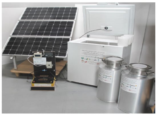 The device, developed by Hohenheim University, comprises a commercially available DC refrigerator that has been enhanced with an adaptive control unit to transform it into a smart icemaker and is powered by photovoltaic (PV) solar panels that convert sunlight into electricity (Figure 4). The system comprises 25 reusable plastic blocks of 2 kg capacity each and two 30 L insulated milk cans that feature removable ice compartments. The smart icemaker utilizes thermal energy storage provided by the 25 ice blocks. Depending on the availability of solar power, the device adjusts its operation to ensure efficient ice production while minimizing energy consumption. The system requires 6 kg of ice to cool 30 L of the morning milk by 21 °C in less than 90 min and preserve it for up to 6 h. The freezer will work at its maximum during the day, and then it will go into “sleep mode” after dark to keep the ice generated during the day. The freezer has a storage capacity of 50 kg of ice, providing up to 4 days of self-sufficiency, even during periods of cloudy weather. Thanks to this device, the evening milk is no longer spoiled and can be stored for up to half a day using 8 kg of ice. In addition, neighboring farmers could benefit from the system by borrowing an insulated can filled with ice, allowing them to cool the morning milk without owning a solar cooling system [].