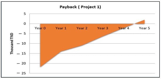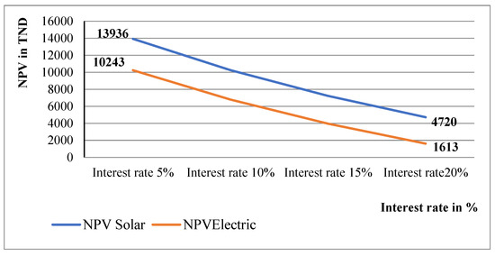 Surprisingly, the outcomes for the PV system yielded a positive NPV due to its lower investment cost compared to the electrical system. In contrast, the electrical system showed a negative NPV of TND −1587.
