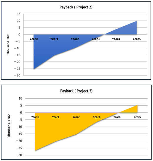 Among the three projects, project 2 emerged as the most lucrative, with an NPV of TND 8497.87 and an IRR of 17% (Table 5). The next most financially rewarding project was project 3, with an NPV of TND 3295 and an IRR narrowly surpassing the 10% threshold. Regarding project 1, the outcomes were unambiguous, with an NPV of TND 2000, making the project appear financially rewarding. However, given that the IRR fell below the symbolic threshold of 10%, it suggests that proceeding with this project would entail an avoidable financial hazard.