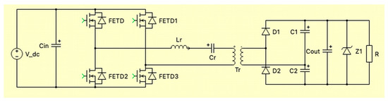 There are several topologies available in the literature that were candidates for the voltage step-up stage of this converter. The following were considered: push–pull, half-bridge resonant converter [8], tri-state current source inverter [9], two inductor boost, forward converter. The LLC full-bridge converter presents some advantages over the other topologies, such as low voltage stress within the primary switches, viable transformers, easy-to-design LLC tanks, and low cost. When compared to the half-bridge topology, the full bridge demands more power switches; on the other hand, it has lower transformer current and no need for a capacitive voltage divider.