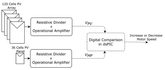 The main MPPT techniques used are studied in depth in [13]. Even though the constant voltage is considered inaccurate in [13], it can be improved by using a low-cost 10 W auxiliary solar panel as an open circuit reference for the MPPT circuitry. That happens because the power panels and the auxiliary panel are all submitted to approximately the same solar radiation and ambient temperature; therefore, the auxiliary panel maximum power point voltage can be used as a reference. Details of this technique are shown in Figure 5. The resistive dividers are responsible for the gain of transformation of the 120 cells PV array to VPV and the 36 cells PV panel to VMP.