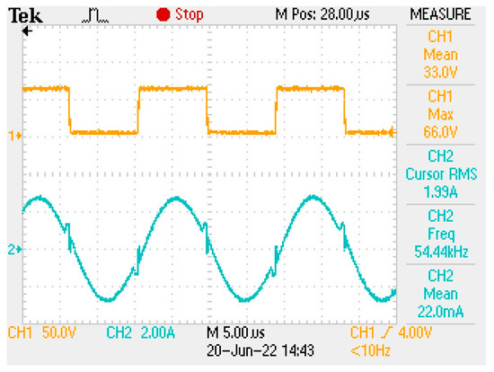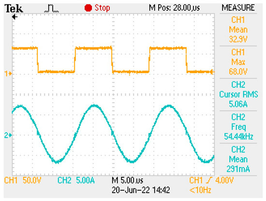 After the design and construction of the converter, the frequency can be manually adjusted according to experimental results aiming to finetune the best frequency. As shown in Figure 8 and Figure 9, it was adjusted to 54.4 kHz. Compared to the calculated switching/resonance frequency, the frequency chosen experimentally is a little bit lower due to the transformer leakage inductance that was not measured; this inductance sums up with the external inductance. Therefore, the system would still be operational with the original resonance frequency. This manual adjustment would be made just in the development stage of the converter; for large-scale production, it is assumed that the leakage inductance would always be approximately the same and would not interfere with the production time. In [10], it is possible to understand if the switching frequency is above or below the resonance frequency. It is not possible to be exactly at the resonance frequency for the entire range of the load, as the resonance is dependent on the equivalent load.