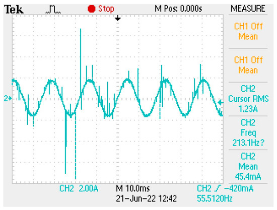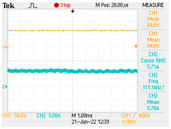 In accordance with [16], we chose to use Silicon Carbide MOSFETs. In contrast to [17], no dissipative snubber was necessary. Figure 10 shows the input voltage and current at full load, while Figure 11 shows the output current at the motor/pump. The current spikes in Figure 11 are noise from the current probe.