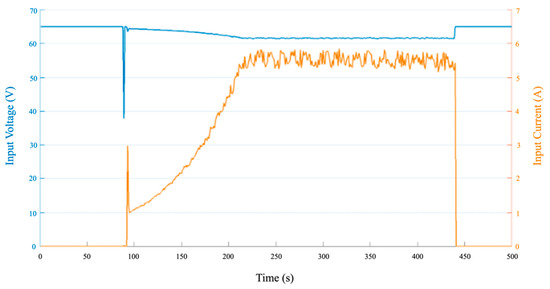 Figure 12. Input voltage (blue) and Input current (orange). Test with solar array simulator.