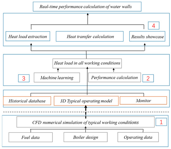 The burner in the furnace under the deep peak shaving condition is often not evenly input, the working fluid in the pot deviates from the designed working conditions, the combustion in the furnace is unsteady, the heat load is uneven and the water dynamic match in the pot is difficult, which often causes the heating surface to overheat [24,25]. Therefore, in this paper a real-time performance calculation method for coupling combustion and hydrodynamic steam temperature is proposed, and the technical route is shown in Figure 1. The reasonable holographic heat load data of the boiler are obtained through CFD numerical simulation technology, the heat load data are coupled with the working fluid side data, the on-site measurement point data are reasonably used, and the real-time performance calculation of the water wall is realized through the heat load screening and heat exchange process calculation. Furthermore, the development of this model is carried out on a 1000 MW boiler participating in deep peak shaving, and all heat load data are screened and distributed to each circuit in the heat load screening stage. In the calculation stage of the heat exchange process, according to the hydrodynamic calculation method, a calculation model of the working fluid heat exchange process is built to realize the calculation of temperature and pressure at any position of each circuit, according to the hydrodynamic calculation method. In the resulting display stage, the calculated temperature, pressure and other result data are displayed through the display platform to test the accuracy of the calculation results, and realize real-time monitoring of the overheating of the local position of the boiler water wall and convection heating surface.