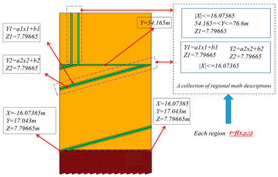 Water wall circuit division: the normal water wall hydrodynamic calculations to divide the circuit are generally 20–30 pipes a circuit, pipe spacing of about 38 mm, a circuit width of 700–1000 mm, boiler CFD calculation due to the large size of the furnace, and the general grid scale is 200–300 mm. According to this circuit, there are only 2–3 grids, so the normal hydrodynamic calculation to divide the water wall circuit is not applicable. Therefore, 2–3 circuits are selected in the water wall calculation to form a large circuit, and the working fluid heat absorption on the large circuit is calculated. The main workload of the circuit division is to construct the mathematical expression of each loop; the function of the expression is used as the basis for filtering the data in the CFD numerical simulation results, and the heat exchange value (Heat-flux) required by each circuit of the load can be filtered out according to the coordinate information (x, y, z) through the Python language. The method of constructing the mathematical expression of each circuit is shown in Figure 4.