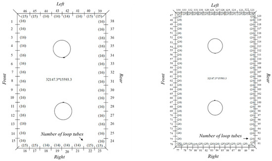 Figure 5 (left) shows a schematic diagram of the calculation loop division of the lower furnace spiral coil. The spiral pipe ring of the front wall and back wall of the lower furnace is divided into 15 circuits, and the side wall is divided into 8 circuits, for a total of 46 circuits. Combined with the heat load distribution curve of the furnace, the number of tubes in each circuit is distributed. The peripheral number in the figure is the circuit number, and the parenthetical number in the inner circle corresponding to the position is the number of tubes in the loop. Among them, 1~15 circuits are arranged on the front wall, 16~23 circuits are arranged on the right wall, 24~38 circuits are arranged on the back wall, and 39~47 circuits are arranged on the left wall. The tube specifications of the lower furnace spiral ring are lower Φ38 × 7.3 mm and upper Φ38 × 8 mm, with a pitch of 53 mm and an inclination angle of 23.391, for a total of 712 pieces. The spiral pipe ring spirals from the inlet of the cold ash hopper to the middle header of the water wall. Figure 5 (right) is a schematic diagram of the calculation loop division of the vertical pipe ring of the upper furnace. The vertical pipe ring of the upper furnace is led out by the middle header of the water wall, and there are 2136 pipes divided into a total of 88 circuits. The tube size is Φ28.6 × 5.8 mm and the pitch is 44.5 mm.