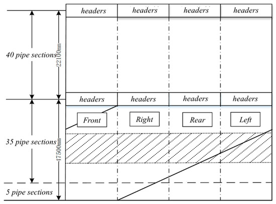 The lower furnace circuit is divided into 40 pipe sections. The water-walled pipes below the inflection point of the cold ash hopper were divided into 5 pipe segments. From the inflection point of the cold ash hopper to the water wall spiral coil at the header in the middle of the water wall, each circuit is divided into 35 pipe segments. Each circuit of the furnace is divided into 12 pipe sections. The schematic diagram of the division of the pipe section is shown in Figure 6.