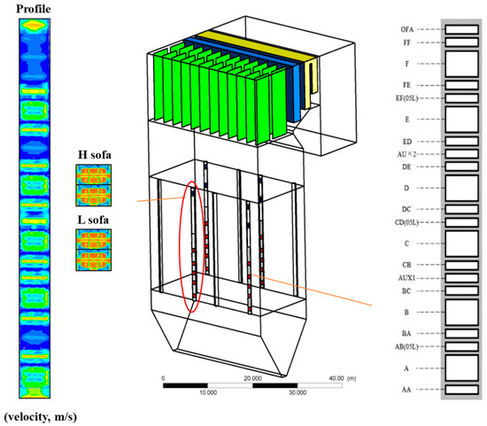 The boiler geometry is shown in Figure 8. The main burner adopts the traditional large bellows structure, and the large bellows are divided into several air chambers by the partition, including one OFA air chamber, one upper end air chamber, six pulverized coal air chambers, eighteen intermediate air chambers, twenty-one middle air chambers, one oil air chamber, two intermediate oil air chambers, and one lower end air chamber. According to the height of each wind chamber, the arrangement of nozzles is shown in the figure on the right. The arrangement of the OFA combustion air chamber at the upper end of the burner controls the NOX emissions, and the setting of two groups of SOFA winds above the main burner further reduces the NOX emissions. The burner pull-open arrangement and reasonable air distribution form can effectively control NOX emissions [26]. We calculated the boundary conditions to ensure that the burner inlet air speed is the design value (see Table 4).