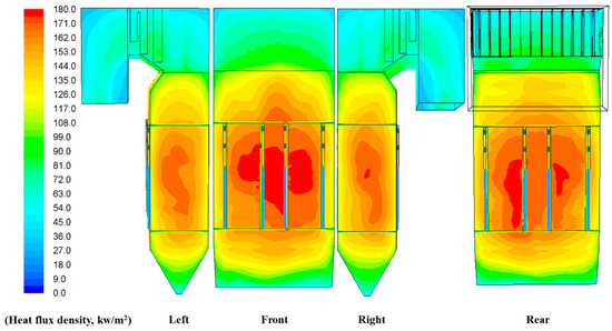 The three-dimensional CFD numerical model of the flue gas side can be found in the literature [17,19]. After the calculation of fluent software, the combustion process of pulverized coal in the boiler is obtained, the heat load distribution data are used when developing the real-time performance calculation algorithm of the water wall, and the three-dimensional display of the calculation result is shown in Figure 9. The highest heat flux density of the furnace wall occurs in the area near the burner on the top floor of the front wall and the separation burnout wind, corresponding to the area with the highest flame temperature of the furnace.