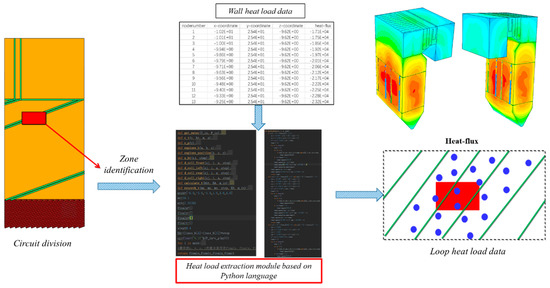 In order to facilitate the use of heat load data, the distribution trend is converted into a binary ASCII format file by using the fluent software’s function, and the converted data have four columns: x, y, z, and heat-flux. The first three refer to the coordinates of the point in m. The last item refers to the value of heat exchange, which is measured in kW/m2. According to the data in the dictionary DICT of Table 3 in the data processing in CFD, the heat load value in each loop range is filtered, and the heat in each loop is solved. The screening process is shown in Figure 10.