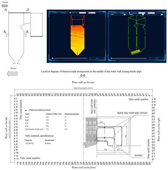 The layout diagram of the on-site water-cooled wall measurement point is shown in Figure 13, intercepting the load operation conditions of the 550 MW unit on site, and the calculation results of the outlet wall temperature of the water-cooled wall according to the feedback of the on-site measurement point data are in good agreement with the measurement data. The error is within 2 °C, which verifies the accuracy of the coupling model. The calculation of full coverage of the wall temperature of the water-cooled wall pipe except the measurement point is realized.